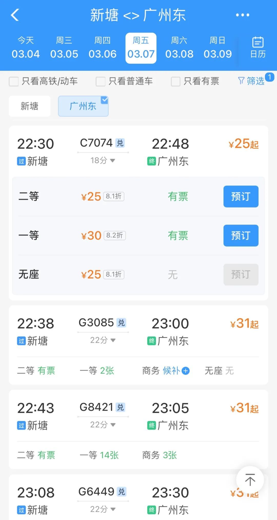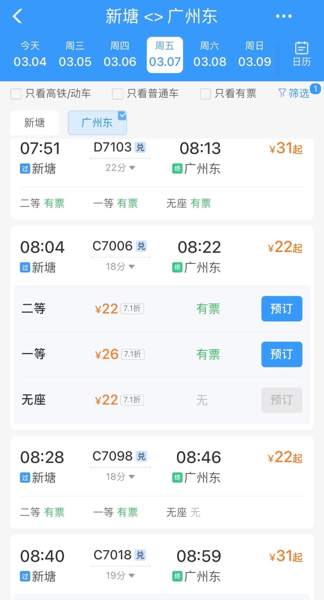 新塘至广州东站早上有两班车次C7006/C7098次,折后价为22元新塘市区上班早上通勤多一个选择