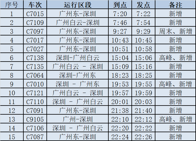 新塘站往深圳方向末班车C7087次于22:26发车,新塘站往广州方向末班车C7074次于22:30发车,末班车的营业时间较调图前均延长了1小时,为商务、休闲等旅客提供便利的夜间出行服务。